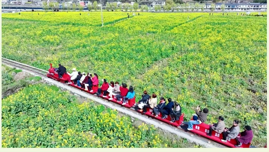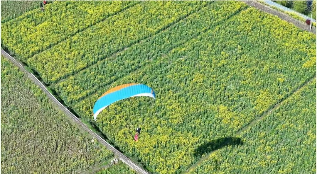 本次活动亮点纷呈、新意十足,最引人瞩目的莫过于创新推出的“云端赏花·飞阅竹溪”低空飞行表演活动。依托中峰镇黄连山得天独厚的地理条件,竹溪打造鄂西北地区首个季节性低空旅游体验基地,滑翔伞飞行员驾驭伞翼翱翔蓝天,在贡米产业园上空上演“空中视觉盛宴”,让游客从高空俯瞰万亩花海,解锁“飞阅竹溪”的独特视角与震撼体验。除此之外,游客们还能登上“开往幸福终点站”的田园小火车,缓缓穿行于金色花海之间,微风拂面、花香萦绕,或拍照留念、或举目远眺,沉浸式感受田园风光的静谧与美好,尽享春日惬意时光。