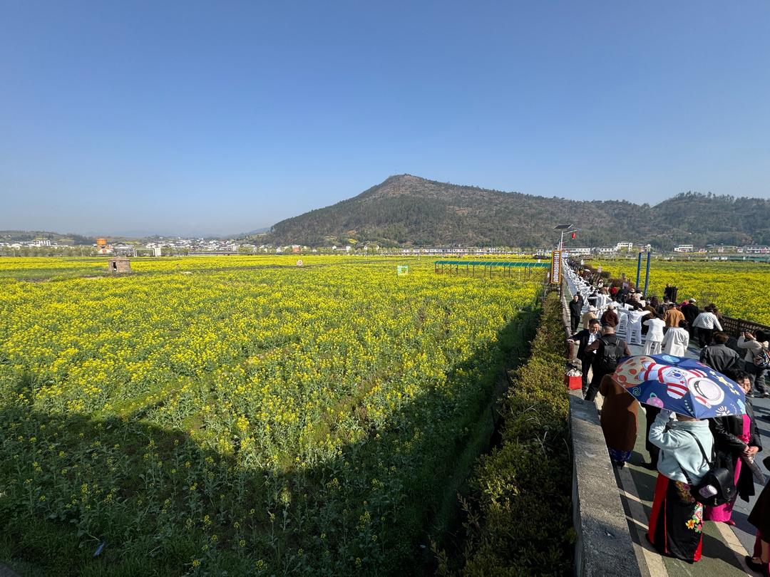 作为竹溪县2026年醉美赏花季活动主场地——中峰镇,以贡米产业园和汤家湾村为核心,打造的万亩油菜花田迎来盛花期,金黄花海与阡陌田园、美丽乡村交相辉映,构成一幅绚丽的春日画卷。游客们徜徉花间小径,或拍照打卡,或漫步赏花,沉浸式感受花香拂面的惬意,更有不少游客参与“聚焦花海·定格春光”春季摄影采风活动,与本土摄影大咖一同捕捉竹溪的生态之美、人文之韵。与此同时,民俗文艺展演轮番上演,竹溪山二黄、船灯、舞狮等极具地方特色的节目依次登台,民间艺人用质朴动人的唱腔、热烈欢快的舞姿,演绎着竹溪浓郁的乡土风情,每一个节目都赢得现场观众阵阵掌声与喝彩。