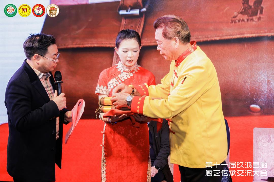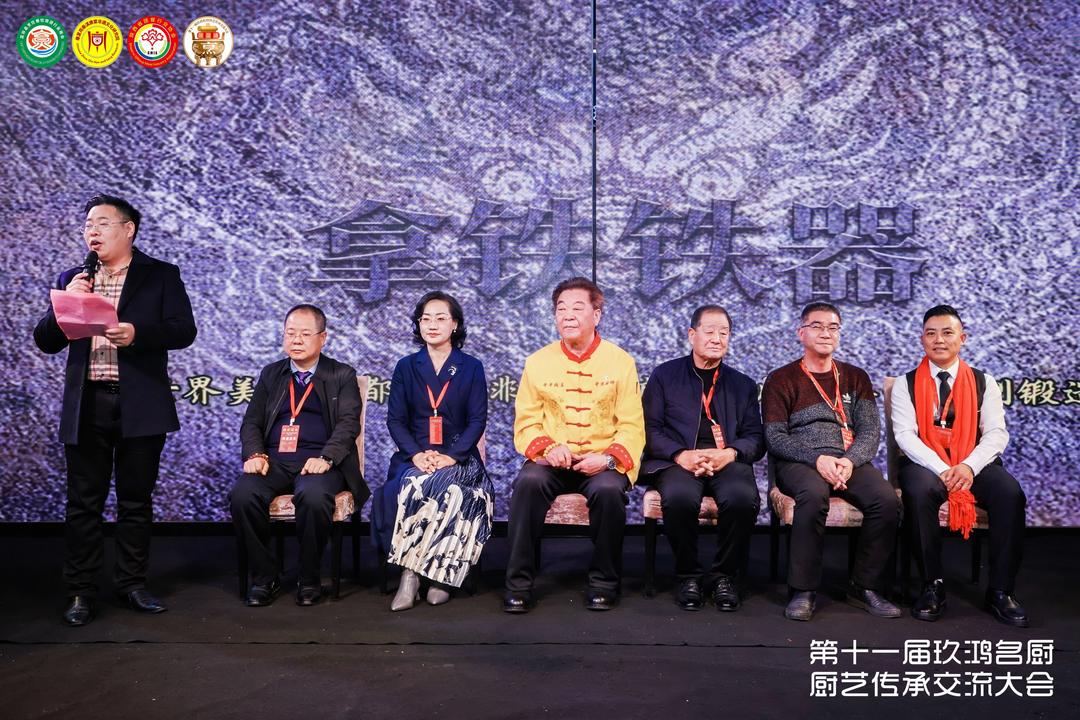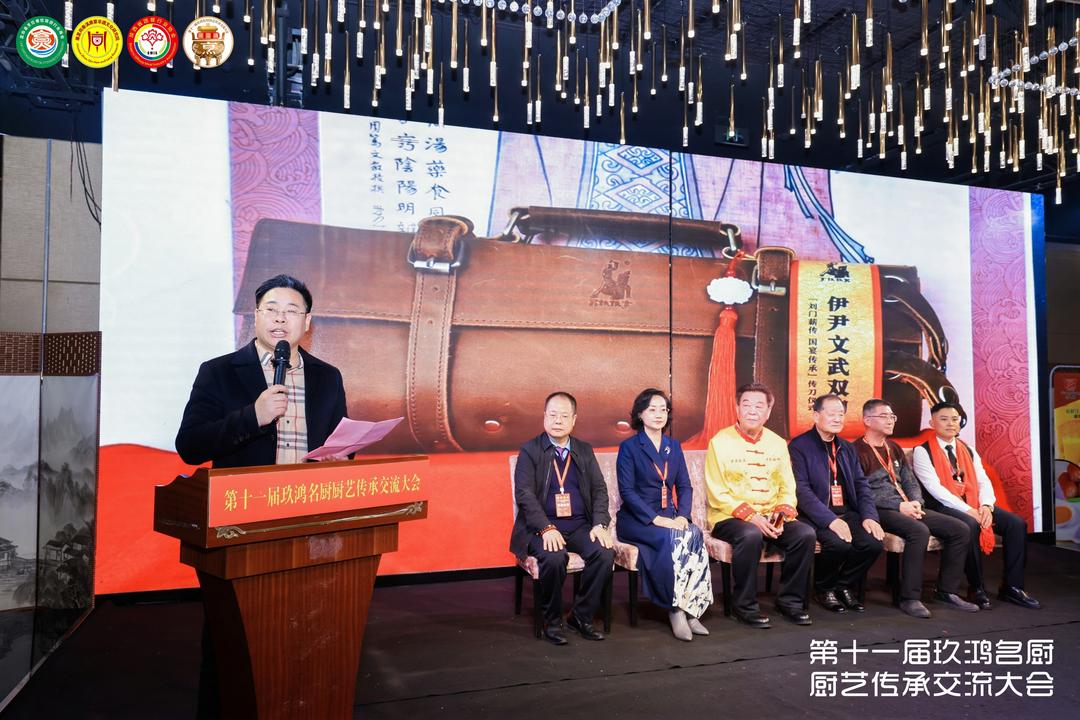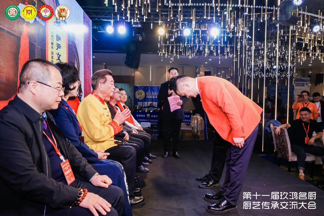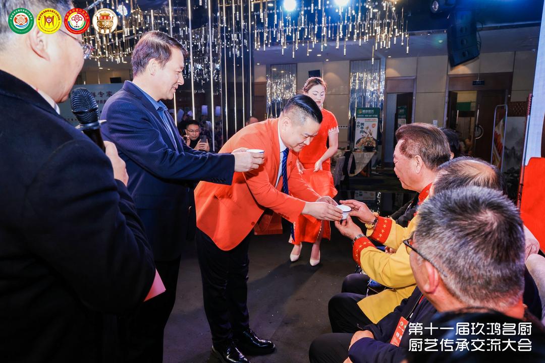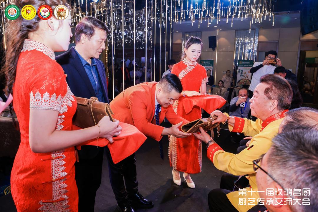 吉时已至,庄重的中式器乐《高山流水》选段渐次响起,传刀盛典正式拉开帷幕。主持人张龙登台致辞,向莅临现场的各界嘉宾致以诚挚欢迎。他言道,伊尹祖师开创中华烹饪之先河,立下“五味调和”的厨道根基;刘凤凯大师深耕厨坛数十载,以匠心坚守厨艺初心。今日,承载着祖师精神与刘师门深厚底蕴的“伊尹”祖师文武双刀,将由刘大师传予新一代传承人张世兴、马鹏海,这既是信物的交接,更是技艺的延续、精神的传承。在全场热烈的掌声中,张龙宣布:刘氏门宗传刀礼正式开始!