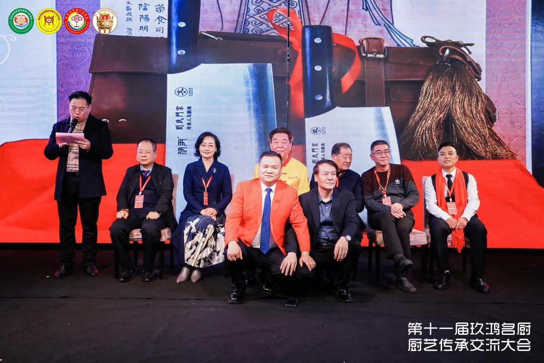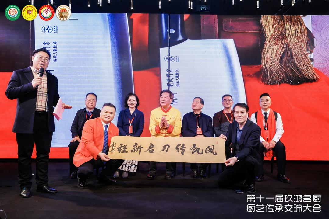 盛典之上,见证嘉宾亦登台致辞,对传刀礼的圆满举行致以热烈祝贺,主持人、著名文化学者张龙也题赠书法作品“凤凯传刀启新程”,同时畅谈行业传承的深远意义,对两位传承人寄予殷切厚望。喜庆祥和的《喜洋洋》旋律响起,主持人宣布:“烹饪大师刘凤凯先生刘氏门宗传刀礼,圆满礼成!”刘凤凯先生、两位传承人与全体见证嘉宾移步台前,共同合影留念。