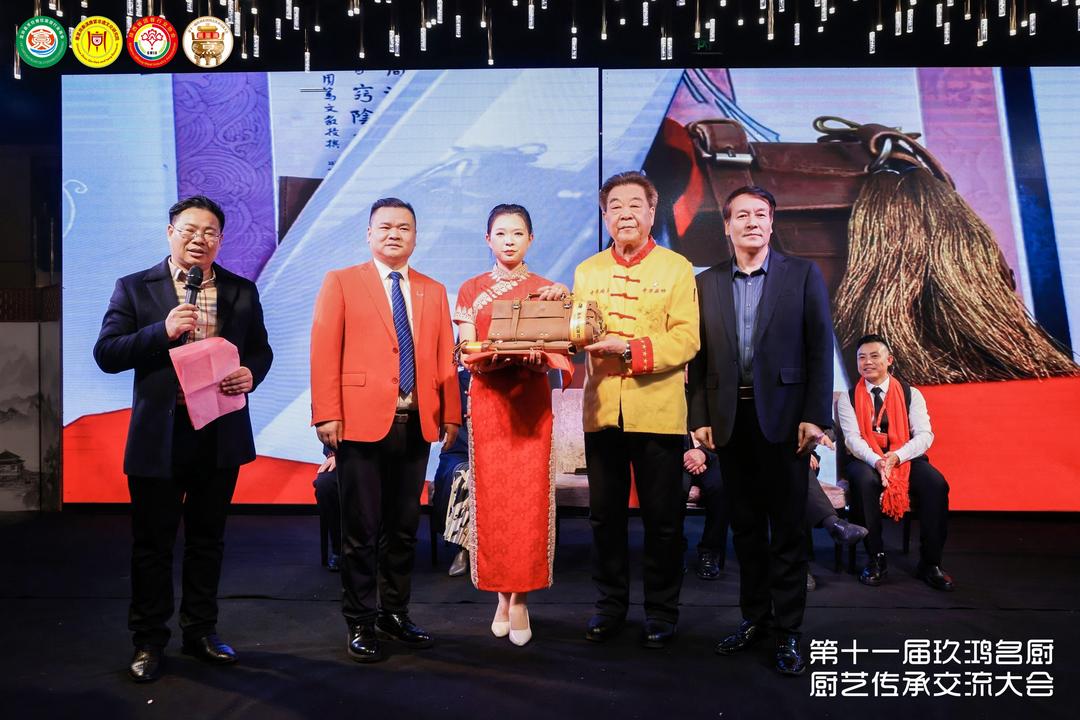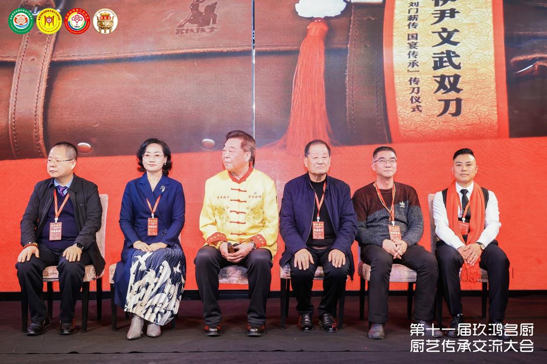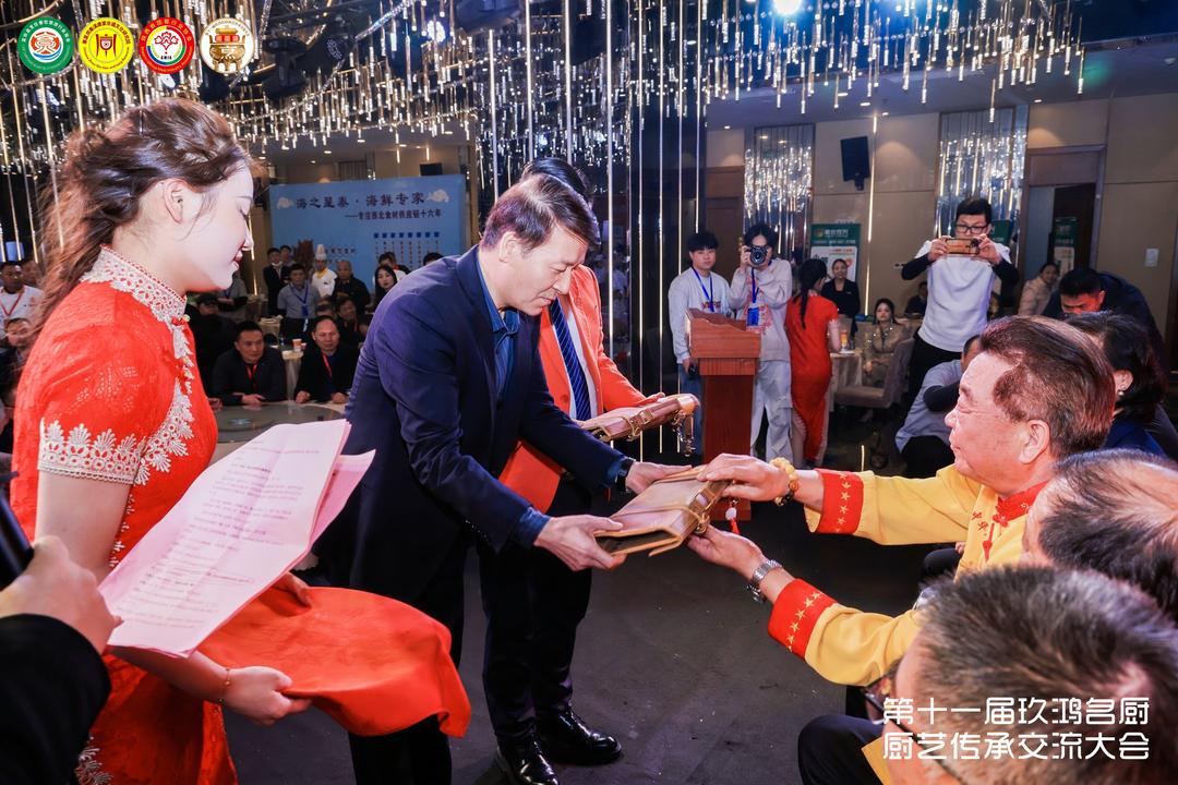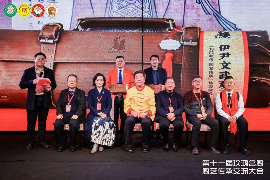 “请传承人恭接文武双刀!请刘大师传刀!”主持人的声音铿锵有力。刘凤凯先生双手捧起刀囊,郑重交付于张世兴、马鹏海手中。这一递一接之间,传递的是沉甸甸的师门重托,是跨越时光的厨道匠心。礼成之后,刘凤凯先生与两位传承人合影留念,镜头定格下这一薪火相传的珍贵时刻。
