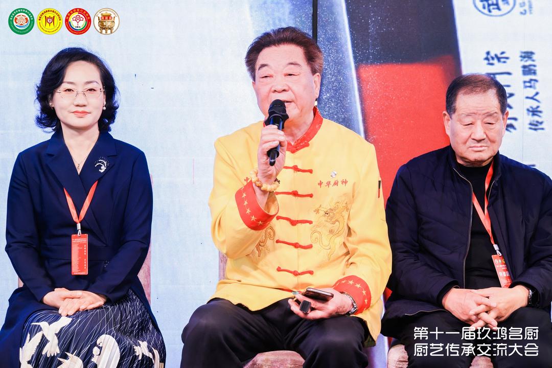 紧接着,全场掌声雷动,有请刘凤凯先生分享传承之心。刘大师手持话筒,言语间满含对厨道的敬畏与对后辈的期许:“各位前辈、同仁及弟子们,今日案上这对顺德非遗手工锻打的伊尹祖师文武双刀,承载厨道精髓——文刀显巧、武刀藏刚,既显刀工讲究,更喻厨者规矩:手艺精、心性刚,技法巧、人品正。”他嘱托两位传承人,望其谨记三言:握刀稳心,坚守本分;传艺修德,恪守底线;守正创新,延续陕菜根脉。“愿你们每次用刀,不忘祖师智慧、陕西风味与厨道初心,以刀承艺、以行立人,灶火不息、厨道不止,文武双全、无往不利!”