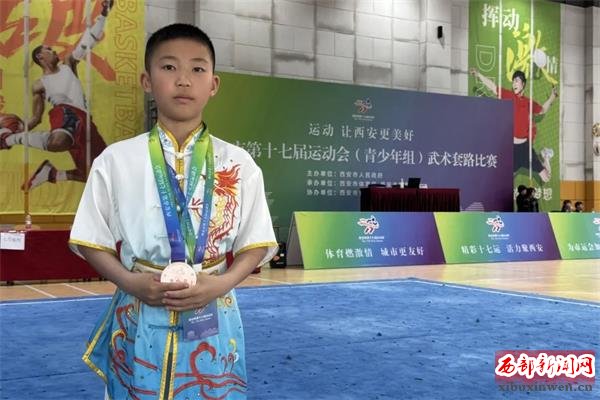 在近日结束的西安市第十七届运动会(青少年组)武术套路比赛中,曲江二中七年级二班郭嘉琦同学表现突出。凭借出色发挥,郭嘉琦同学代表曲江新区荣获男子甲组长拳+刀术全能第三名的优异成绩。