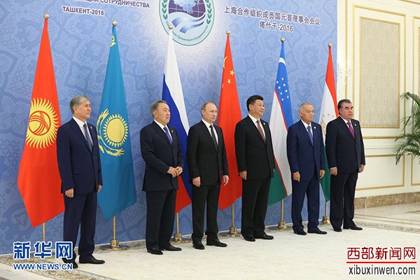 图为:2016年6月24日,国家主席习近平在乌兹别克斯坦塔什干出席上海合作组织成员国元首理事会第十六次会议并发表重要讲话。这是小范围会谈开始前,成员国元首集体合影。
